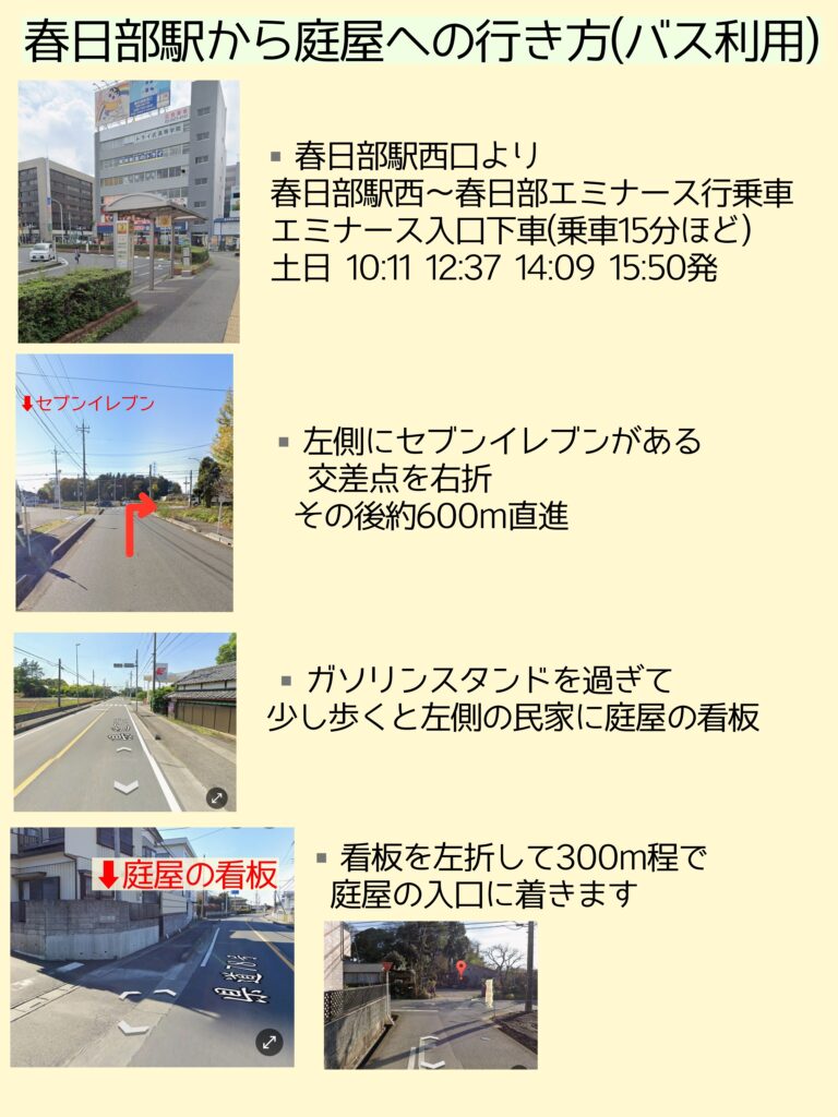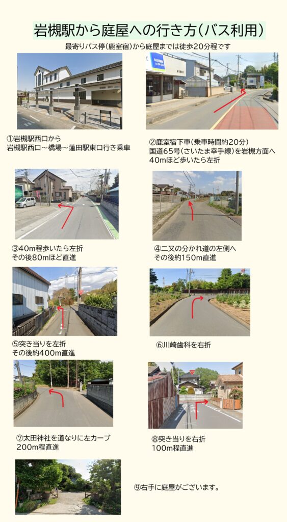 庭屋にお越しいただく際、駅からかなりの距離がありますため基本的には自家用車か最寄り駅の白岡駅、東武動物公園駅からタクシー利用をおすすめしておりますが、バスもご利用いただけます。