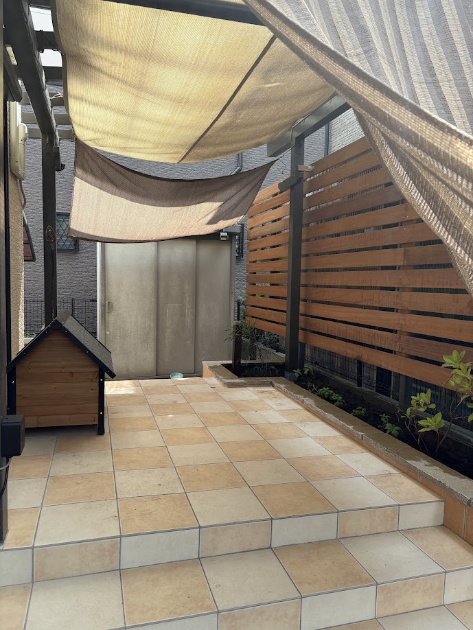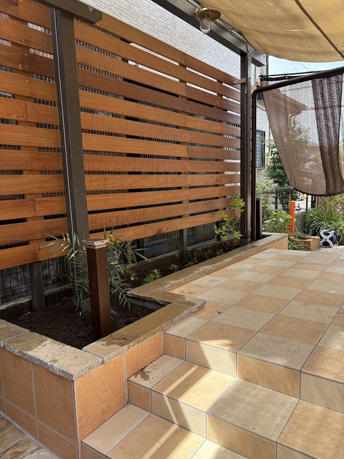 明るい色のタイルで華やかな印象に。ウッドフェンスも新調してメンテナンスもしやすい庭に!
